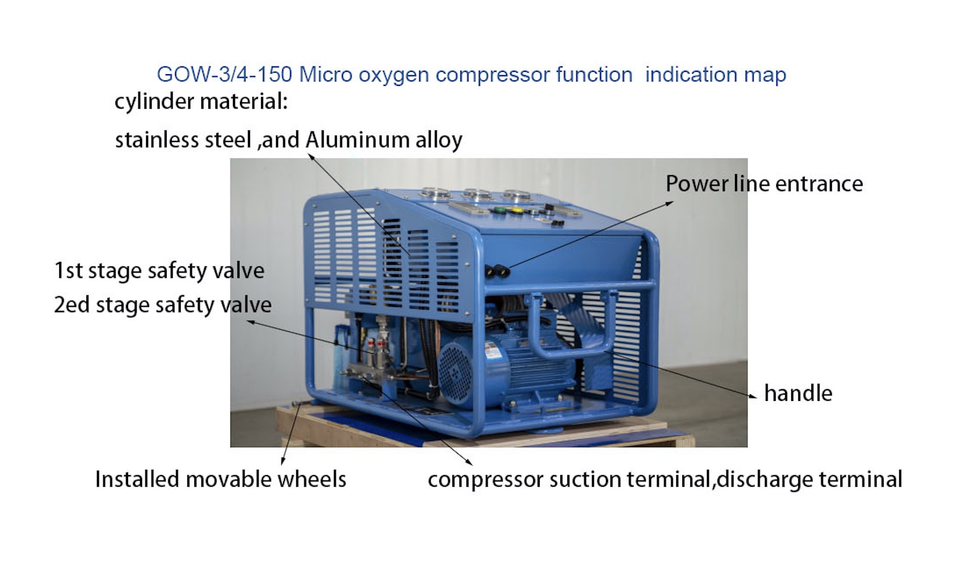 yüksek basınçlı endüstriyel oksijen kompresörü iki kademeli sıkıştırma, paslanmaz çelik silindir benimser, giriş düşük emme basıncı koruması ile donatılmıştır, egzoz ucu yüksek egzoz basıncı koruması ile donatılmıştır ve egzoz sıcaklığı yüksektir. Sıcaklık aşırı basıncı aşarsa, sistem güvenli çalışmayı sağlamak üzere alarm verir ve durur. Küçük boyutlu, hafif ve tekerlek ile donatılmış, mobil kullanım için çok uygundur.